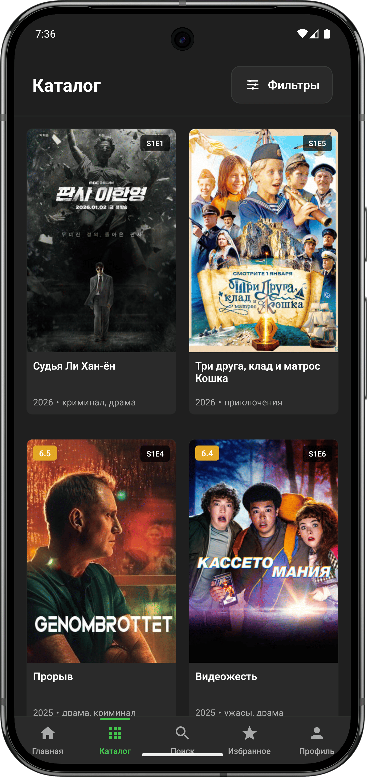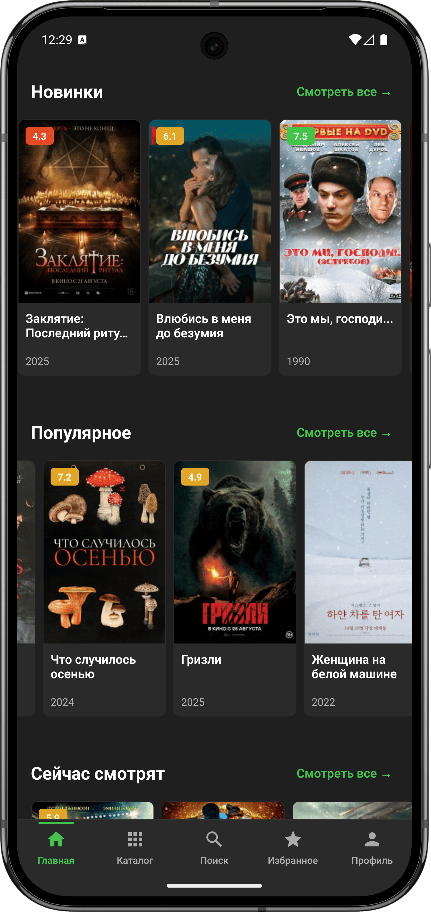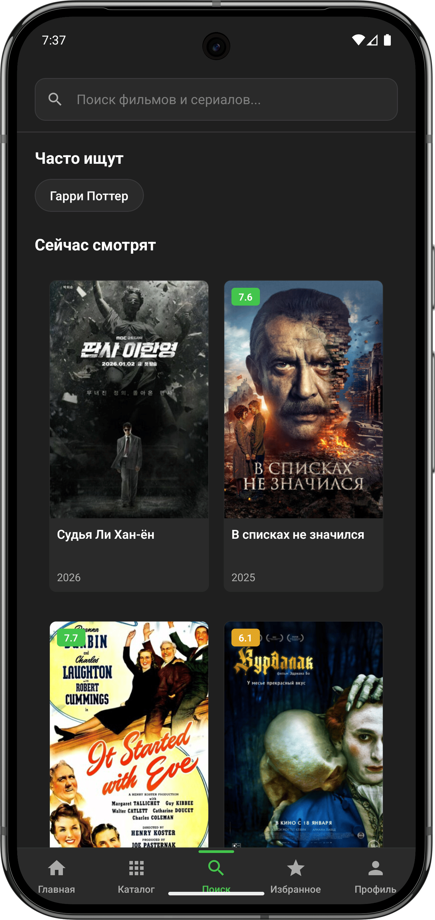 Быстрый и удобный поиск с подсказками в реальном времени. Находите нужные фильмы за секунды. История поиска и популярные запросы всегда под рукой.