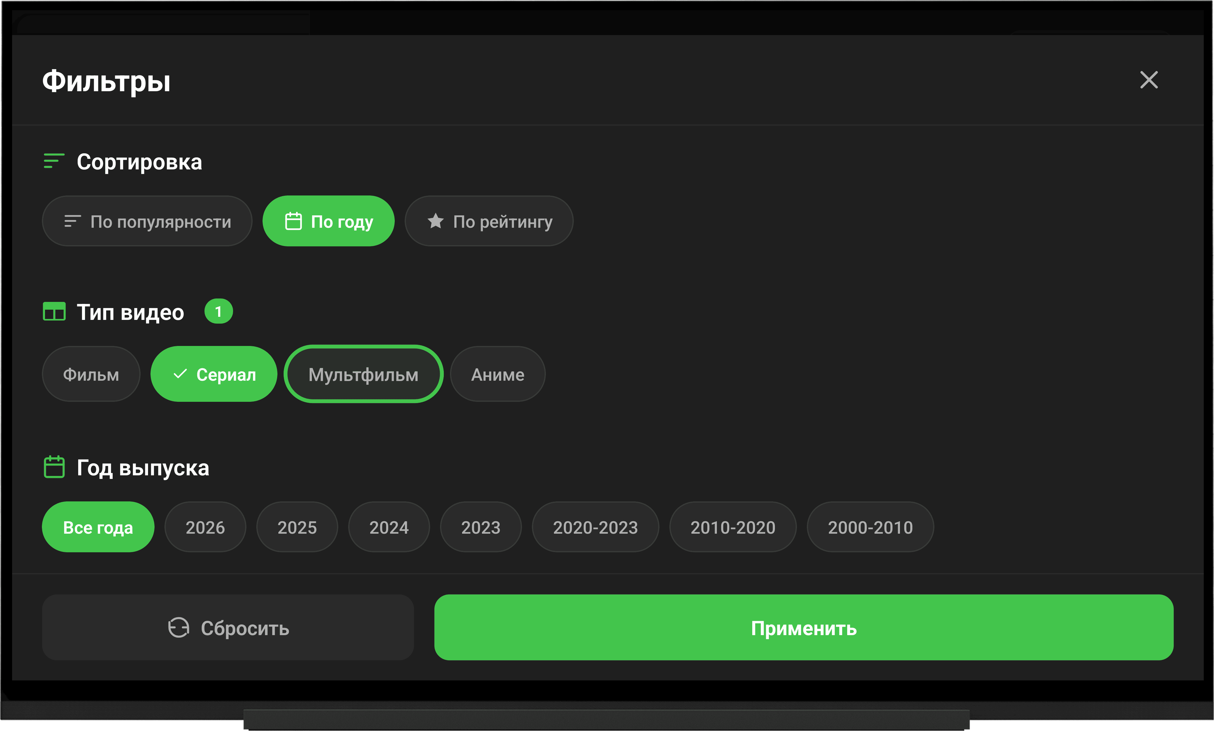 Фильтруйте по жанрам, годам, странам, рейтингам. Сортируйте по популярности, новизне, рейтингу. Находите именно то, что хотите.